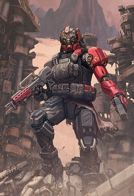 During the Unwelcome War between Gafia and Estancia, Gen. Titus Vanovich of Omanga, on the side of the Gafians, led a division of troops through the Vlachia Gray Zone straight into the Estancian heartland, where he and his men unleashed a biochemical weapon, bringing a terrible Gray Storm down upon the country, hastening the already ongoing process of desertification and sealing the kingdom’s doom. The man known as Gauntlet was a youth when he joined Titus' march. He was cunning and an intelligent fighter, but overconfident. No one knew where he came from, and he refused to show his face - many suspected him of being an Estancian defector. During the fighting, he lost his arm. But when he returned to Omanga, he was strangely overjoyed to have a powerful mechanical gauntlet grafted to his body. Impressed by his resilience and guile, Titus recommended Gauntlet to have his own independent platoon. Now, Gauntlet and his “Blacksand Squad” patrol over the Estancian Gray Zone, where they frequently skirmish with the Agurtan Hellbenders and Soil Ghost warriors.