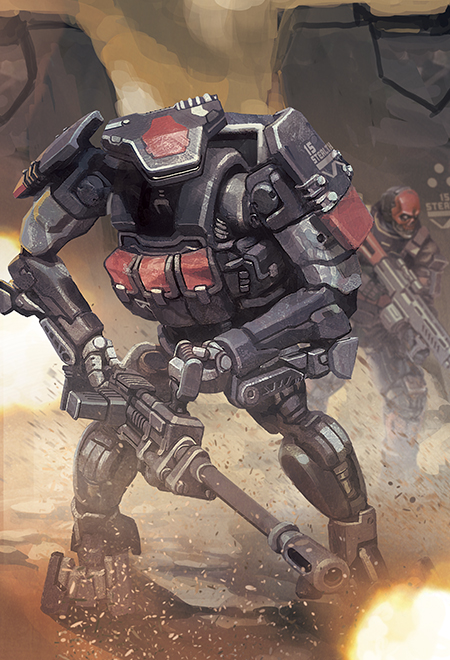 Nicknamed "Bigfoot”, the Interceptor Camelbot HR52e is remodeled from the original NAUS Camelbot for Agurts’ 15th Stealth Team. Featuring sturdier joints and larger feet that enable them to navigate complex field terrain, these mechanized soldiers wield greater control of heavy-recoil mounted machine guns than human soldiers.